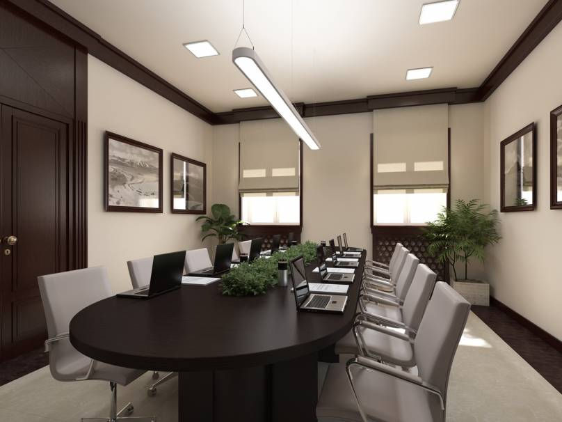 The design of the Ambassador’s office is particularly noteworthy. Decorative plaster alternates with vertical wooden elements, creating a textured and refined composition. All radiators are concealed behind carved decorative panels featuring Armenian motifs. The resulting interior possesses pronounced national character, dignity, and a distinguished sense of cultural identity.