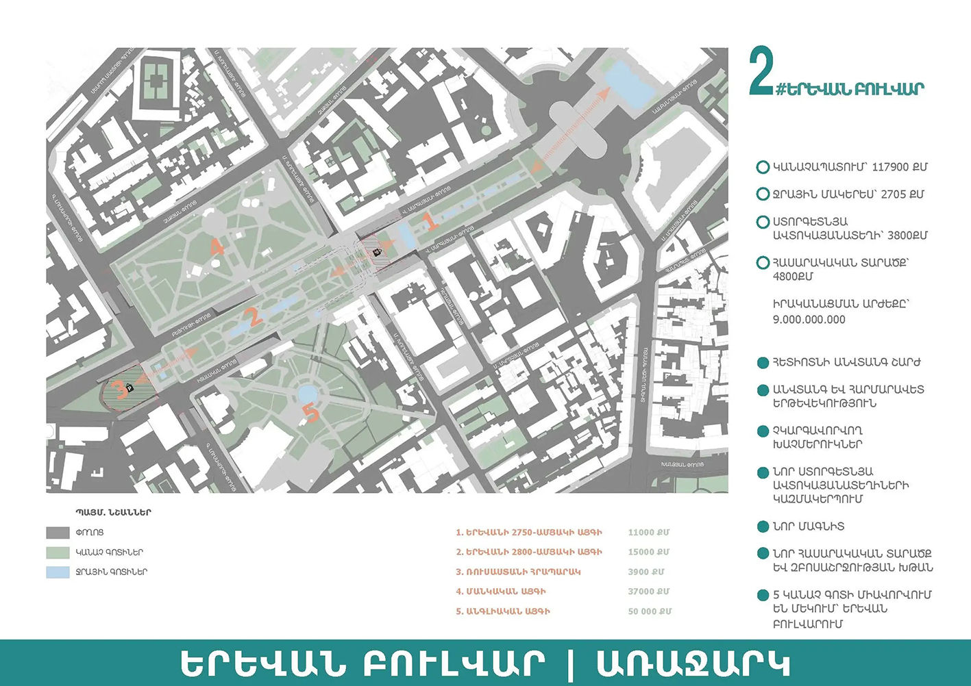 The design unites five existing green zones into a single continuous Yerevan Boulevard. These zones include Yerevan 2750th Anniversary Park, Yerevan 2800th Anniversary Park, Russia Square, Children's Park, and English Park.