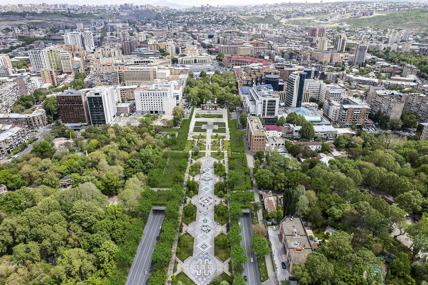 The unified boulevard celebrates Yerevan's 2800th anniversary through thoughtful landscape design. Geometric patterns and formal layouts reference Armenian cultural traditions while creating contemporary public spaces.