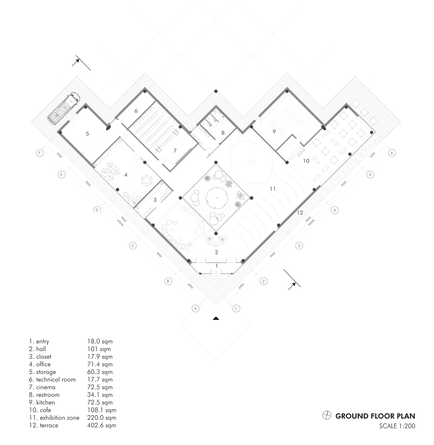 Service spaces (WC, storage, offices) are grouped in the far left corner. All areas are linked by a covered atrium and winter garden.